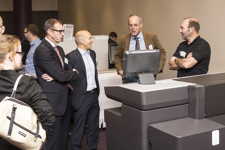 HP-Repräsentant Arjen Zandbergen aus Barcelona erläuterte im vollbesetzten Kongresssaal des Mannheimer Dorint-Hotels die Eigenschaften der HP-Innovation. Ein HP-PageWide-Druckkopf druckt mit mehr als 200.00 Düsen. Das Page Wide-Gerät wird es mit verschiedenen Ausbaumodulen geben, zum Beispiel mit Scanner sowie mit Faltereinheit vom Hersteller Este aus Berlin.