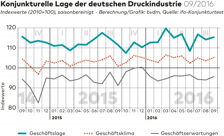 Das Stimmungsbild in der deutschen Druckindustrie zeigt sich erfreulich. Der saisonbereinigte Index zur Beurteilung der aktuellen Geschäftslage von Druckunternehmen stieg im September 2016 um 1,2 Prozent gegenüber dem Vormonat. Das derzeitige Indexniveau von 115,4 Zählern lag mit 3,9 Prozent auch über dem Vorjahrestand. Zudem wurden die ersten drei Quartale 2016 mit im Durchschnitt 114,7 Punkten um 1,9 Prozent besser beurteilt als der entsprechende Vorjahreszeitraum.