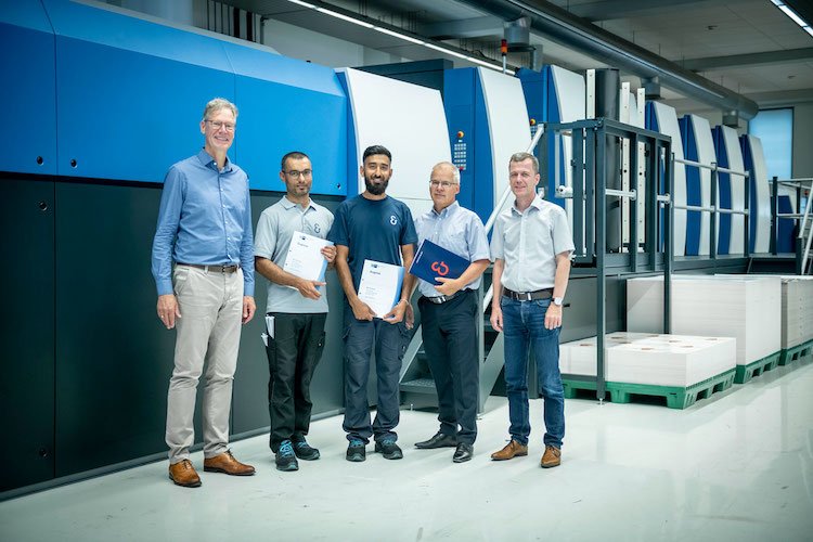 Das Bild zeigt die beiden Facharbeiter Bilal Ahmad (2.v.l.) und Saad Malik (M.) mit ihren Ausbildungszeugnissen. Sie erhielten im vergangenen Jahr ihre unbefristeten Arbeitsverträge aus den Händen von Ralf Sammeck, Vorstandsmitglied von Koenig & Bauer und CEO von Koenig & Bauer Sheetfed, Ausbildungsleiter Jochen Mann (2.v.r.) sowie Personalleiter Markus Rasche (r.). (kü)