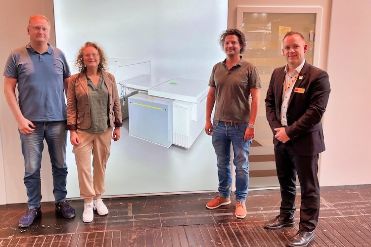 Das Bild zeigt (v.l.): Hannes Sandler (Geschäftsführer/Managing Director), Karin Sandler (Prokuristin/Authorized Signatory) und Maximilian Demczuk (Technischer Leiter/Technical Manager) von der Druckerei Sandler sowie Mario Klossner, Kodak Print Solutions Sales Specialist mit Zuständigkeit für Österreich und die Schweiz.
