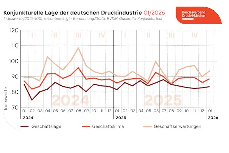 Zum Jahresbeginn 2026 verbesserte sich das saisonbereinigte Geschäftsklima in der deutschen Druck- und Medienindustrie. Der vom Bundesverband Druck und Medien (BVDM) ermittelte saisonbereinigte Geschäftsklimaindex wies gegenüber dem Vormonat ein Plus von 2,5 Prozent auf. Mit 88,6 Punkten lag der Index damit im Januar rund 3,0 Prozent über dem Niveau des Vorjahresmonats. Sowohl die Geschäftssausichten für die nächsten sechs Monate als auch die aktuelle Bewertung der Geschäftslage der Betriebe fielen im Vergleich zum Vormonat besser aus.